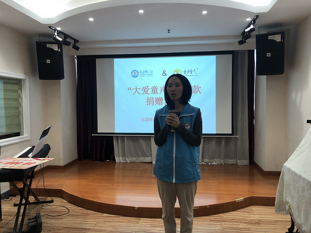 瓦蓝栈公益基金会干事李玉艮上台发言,对小朋友的爱心表示衷心的感谢,并告诉大家善款的用途,李干事告诉大家,这笔善款将用于为100名贫困学生送上一套崭新的文具。